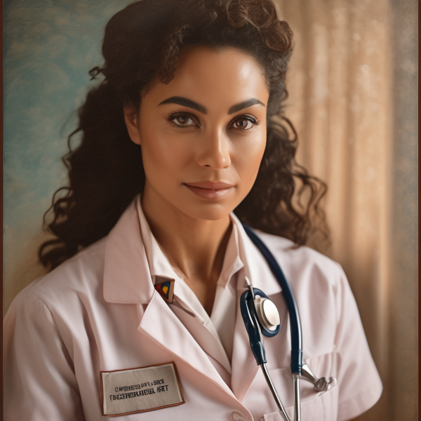 2. Break down the portrait into layers: background, base skin layer, hair, uniform, facial features, and additional details like a stethoscope or badge.
